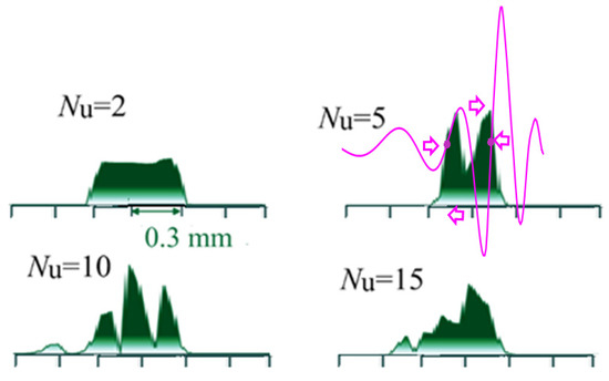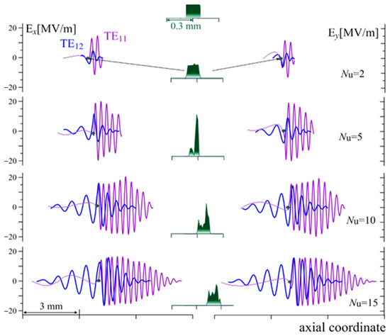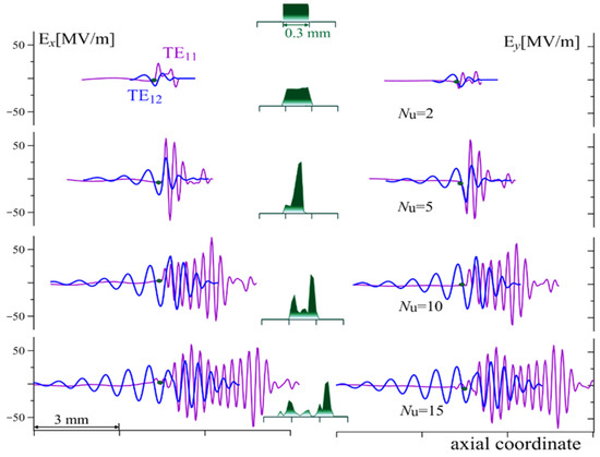 Figure 3 shows the results of the numerical simulation for the electric field of the radiated pulses and the dynamics of the linear charge density of the bunch (green fills) at different points in the interaction space. The blue curves correspond to the TE12 mode being close to the group synchronism with the electron bunch. In fact, the initial stage of emission of such a wave packet is the formation and subsequent amplification of a single wave cycle (Figure 3, Nu = 2–5) [44]. At the same time, diffraction of the wave pulse inside the waveguide leads to a gradual transformation of a short single-cycle wave pulse into a longer one, represented by several wave cycles. The electron bunch is located in the region of the maximum electric field of the emitted pulse, so that at the first stage of the electron–wave interaction process (Nu < 10), the amplitude of the “central” cycle increases due to the amplification of this cycle by electrons. However, at a distance corresponding to 10 undulator periods, the decrease in the amplitude due to the dispersion of waves in the waveguide by interaction begins to prevail over the increase in the amplitude of the central one due to the electron–wave interaction. A similar process (but in the approximation of one transverse waveguide mode) of formation and amplification of a short wave pulse, which is in group synchronism with electrons, is described in more detail in the work [44].
