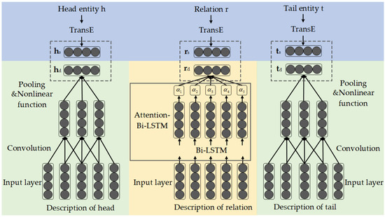 - Representation learning of relation description (yellow area): The relation description of the triple refers to the text containing the entity pair . The Attention-Bi-LSTM text encoder is designed to mine the semantic information in the relation description to obtain the text representation of the relation, which is denoted as .