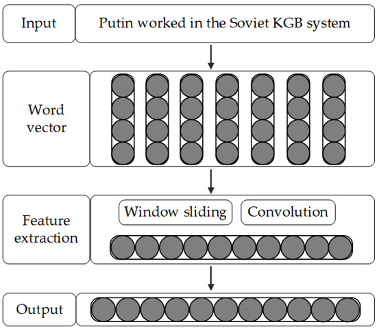 - Convolution layer: The input and output of the convolution layer are represented by and , respectively. Because the length of the text description statement is different, the length of the input vector is inconsistent. After setting the maximum sentence length for the convolution operation, if the sentence length is less than , the end of the embedding vector of the sentence is filled with 0, and if the sentence length is greater than , the redundant words are removed. We need to add 0 to the end of the embedded vector of the sentence. Then, the input vector is processed based on the sliding window mechanism. We define the size of the window as , set the step size of the sliding window as 1, and the content of the sliding window is . The corresponding output vector is extracted by a convolution operation. The specific formula of this process is defined as follows:where represents the convolution kernel, m is the dimension of the output vector, n represents the dimension of the input vector, represents the bias term, and represents the activation function.
