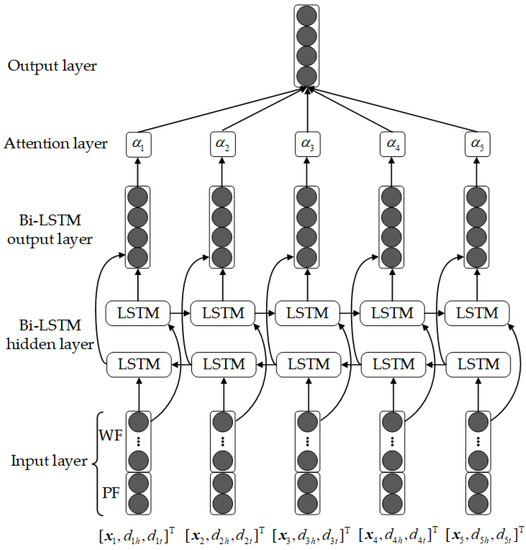 where represents the encoding process of LSTM. Each output unit of Bi-LSTM is connected to the forward and backward LSTM hidden layers at this time. The output vector at time is as follows: