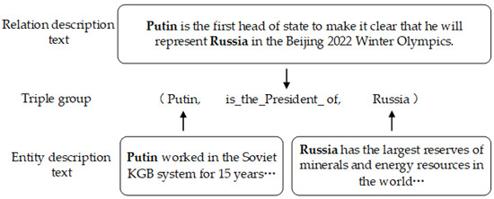 Relational description refers to sentences containing entity pairs. Corpus NYT [15] is an existing work. Sentences were selected from New York Times articles to align with FB15K for joint learning. To ensure alignment accuracy, we only considered those sentences with anchor text linking to the entities in FB15K. We extracted 876,227 sentences containing both head and tail entities in FB15K triples and annotated them with the corresponding relations in triples. The sentences were labeled with 29,252 FB15K triples, including 629 relations and 5244 entities. Figure 4 shows an instance of a triplet in the dataset that contains both the relationship description and the entity description.