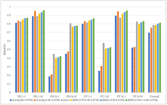 In addition, we visually compared the prediction performance of Joint, Jointly(Bi-LSTM), Jointly(A-Bi-LSTM), JKRL(CNN+Bi-LSTM), JKRL(A-Bi-LSTM) and JKRL(CNN+A-Bi-LSTM) under different relationship types. The specific comparison results are shown in Figure 6, where “PH” and “PT” represent head entity prediction and tail entity prediction, respectively.