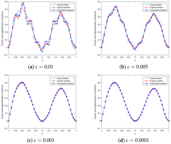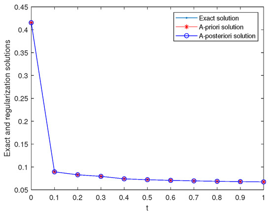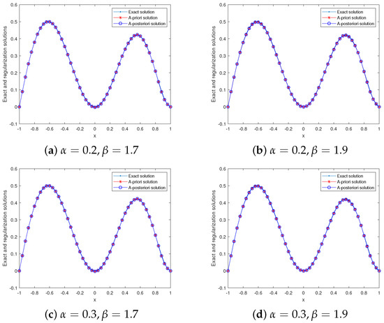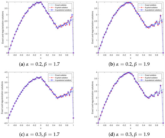 Since , we took , and selected to perform the numerical experiment. For , , and , , and , the computation results of the exact and regularization solutions are shown in Figure 6. For , , and , the calculation results for the relative errors and a priori and a posteriori regularization parameters are presented in Table 3. Figure 6 and Table 3 show that our method is also effective in solving the inverse problem whose solution is a non-smooth function.