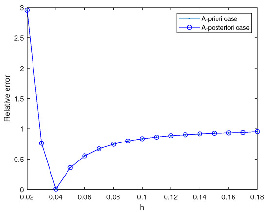 Note, that for the a priori case, we always require the a priori bound E of the exact solution during the computational procedure. We know that, as belongs to (), one can compute =. Moreover, is obvious. Additionally, we then take , and . In order to compute the Mittag–Leffler function, we adopt the algorithm in [51]. For the a priori case, the regularization parameter N is chosen by (47), and the regularization parameter under the a posteriori case is chosen by the stopping rule (54). In Example 1 and 2, we verify the computation results of the relative errors using the Galerkin method and the Quasi-Boundary Value method (QBV method) mentioned in [35]. Meanwhile, for the a priori case, the regularization parameter of the QBV method is chosen by . For the a posteriori case, we adopt the stopping rule presented in this paper.