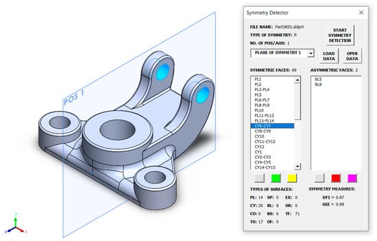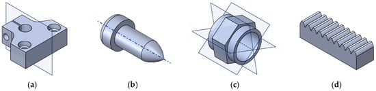 Symmetry is an important geometric property often exploited in mechanical engineering. It is useful in engineering drawing [1] and design [2], manufacturing [3], engineering simulation [4], knowledge discovery [5,6], vibration analysis [7], assembly [8], robotics [9], and so on. In engineering design, the existence or lack of symmetry in parts or assemblies can be an important factor to consider during computer-aided design (CAD). Designing parts and (sub)assemblies symmetrically can simplify the three-dimensional (3D) modeling process by reducing the complexity and number of individual parts or simplify the assembly process and reduce assembly errors [8]. For instance, the number of individual parts in the assembly CAD model can be reduced by replacing mirrored parts with one symmetrical part [2]. Designing a part with multiple reflectional symmetries usually results in shortened handling times and can also reduce the possibility of assembly errors caused by incorrect part orientation [10]. The design engineer may need to verify if the CAD model is exactly symmetrical and, thus, the design intent is met. In finite element analysis, the symmetry of the CAD model can be exploited to idealize the model and reduce its mesh size, which can considerably shorten the simulation run-time [4]. Hence, the extraction of the symmetry information (i.e., of the planes, axes, or points of symmetry) from 3D CAD models is of vital importance, not only during CAD but also in many downstream activities such as computer-aided engineering (CAE), computer-aided process planning (CAPP), computer-aided manufacturing (CAM), etc. However, the symmetry information is seldom directly stored in native CAD models and never in the neutral exchange file formats (e.g., STEP, IGS, Parasolid, etc.). For that purpose, computer-aided symmetry detection (CASD) is employed, which enables the (semi)automatic extraction of the symmetry information using the 3D CAD model as input or any other 3D or 2D digital object.