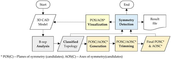 First, the B-rep of the input 3D CAD model is analyzed and classified. Then, the plane and axes of symmetry candidates are generated. The proposed framework utilizes a hybrid approach where the candidates are derived from the principal axes of inertia, single faces, as well as matching of similar face pairs. The generated candidates are subjected to trimming, where duplicates and unsuitable candidates are removed. In the symmetry detection step, the final candidates are evaluated to identify the actual planes and axes of symmetry and visualize them in the 3D CAD model.