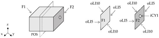 The computational accuracy of the implemented symmetry detection framework, which has been set to the manufacturing accuracy in mechanical engineering (ε = 10−6 m), can be achieved for analytical surface types but, in some cases, not for the numerical surfaces (particularly B-splines, revolved, and blended surfaces). For instance, sometimes, two symmetric faces may have different values of the surface areas, even when they have been created by a mirroring operation, and should be equal. At this point, further research is needed to investigate whether that is an implementation issue (related to the particular CAD system used) or a numerical problem (across different CAD systems) caused by the approximation of numerical surfaces in geometric modeling. The second type of failure of the computational accuracy is related to the calculation of the face center from the surface parameterization (Figure 12).