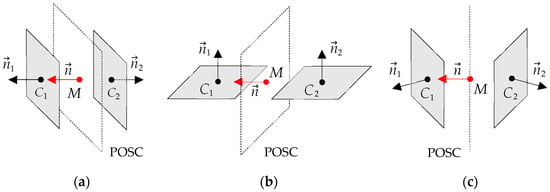 To evaluate the coincidence criterion, the mid-point between two face centroids for each face pair is evaluated with respect to the corresponding plane of symmetry candidate by means of the point-to-plane distance analogous to Equation (22), in this case, denoted as dM. The point-to-plane distance dM needs to be within a specified tolerance dM ≤ ε to fulfill the coincidence criterion. The final criterion that needs to be met by the face pair is the orientation criterion. For that purpose, the cross-product vector between the orientation vector and the plane of symmetry normal vector is calculated for each face pair: