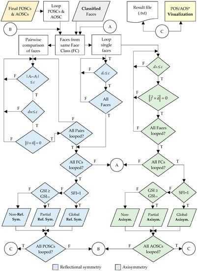 Once the planes and axes of symmetry candidates have been generated, they are subjected to trimming where possible duplicates or unsuitable candidates are eliminated. Duplicate candidates are those which are coincident with each other (i.e., the planes or axes lie upon each other). This can be queried with Equations (15) and (21) and with the length of the cross-product between the plane normals or the axis directions, which needs to be zero. Unsuitable candidates are those which are significantly distanced from the COG and, therefore, not expected to become the actual planes or axes of symmetry. Exact reflectional or axisymmetric 3D CAD models can have planes or axes of symmetries that pass through the COG, and their direction matches the principal axes’ directions [14]. However, this will not apply to partially symmetric models, although their planes and axes of symmetries will still be close to the centroid [49]. Hence, to take advantage of this, the point-to-plane distance dPOSC can be exploited for computing the distance between the COG and the plane of symmetry candidate: