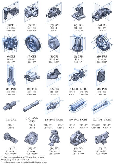 For the estimation of the global symmetry index threshold value GSITH, Figure 15 gives the plot of the GSI vs SFI for each 3D CAD model. The 3D CAD models were divided into three categories: exact global, partial, and non-symmetric. As already stated, the SFI measures the symmetry of the topology, while GSI measures the symmetry of the geometry. Exact global symmetry implies that SFI = 1 and GSI = 1. In the case of partial symmetry, SFI < 1 and GSI ≥ GSITH. Non-symmetry implies SFI < 1 and GSI < GSITH. Based on the results (Figure 16) for the given set of CAD models, the global symmetry index threshold value can be set to approx. GSITH = 0.70 as the border between partial symmetry and non-symmetry. However, this is only a proposal, and it can be left to the user to select its own GSITH.