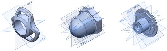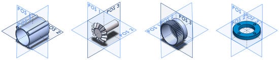 The testing has revealed that the framework may be sensitive to 3D CAD models exhibiting multiple reflectional symmetries. The failure to detect reflectional symmetry is related to the lack of planar surfaces used by the framework to identify the planes of symmetry candidates. Figure 11 shows some typical 3D CAD models with FN symmetry detection outcomes (the mechanical parts where this can happen are gears or parts that are dominantly compounds of cylindrical surfaces). Although, in that case, several planes of symmetry have been detected from the principal axes of inertia, the symmetry detection in those parts can be considered incomplete.