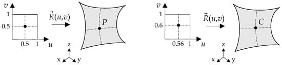 Using the uv mid-point (e.g., u = 0.5 and v = 0.5) in the parameter domain to compute the center point on the surface may not necessarily represent the actual face center (left). To compute the face center, different values of the uv parameters may be required (right).
