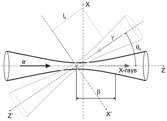 A scheme of the photon–electron beam interaction is shown in Figure 1. We consider the incident photons to be monoenergetic and unidirectional. We assume also that the phase space densities of the electrons and photons are described by Gaussian functions. Then, the final expression for the matrix of the X-ray photon flux into the frequency interval and into an element of solid angle (spatial matrix density function) can be written through the integration [12]: