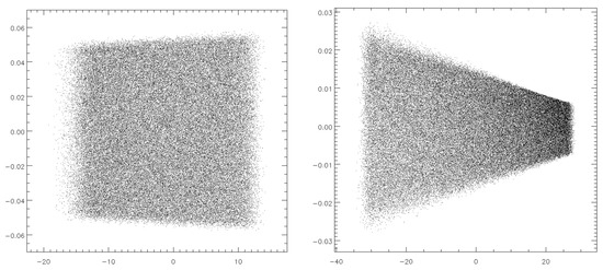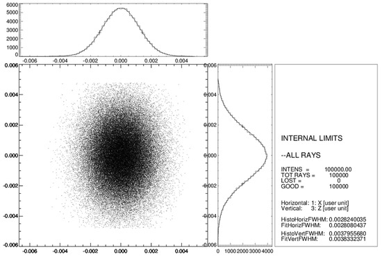The X-ray optical layout of the simulated ICS beamline is shown in Figure 5. As mentioned above, the divergence of the input radiation was limited by the slits of the monochromator: 0.8 mm (horizontal) and 0.4 mm (vertical), located at a distance of 2000 mm from the ICS. Close to the slits, a single crystal monochromator was positioned. The monochromator was a (220) germanium crystal that was set for operations in the anomalous transmission mode (Borrmann scheme). Then, two grazing incidence X-ray mirrors in a Kirkpatrick–Baez configuration were implemented to produce a focused beam: a vertical elliptical mirror and a horizontal elliptical mirror at distances of 2610 mm and 3000 mm from the source, respectively. The parameters of the mirrors are given in Table 2. The mirror’s lengths were determined using the SHADOW code by the footprint dimensions of the beam on the mirror surfaces (see Figure 6). Both mirrors were considered to be ideally shaped, smooth, and covered with platinum. The grazing angle of the central ray in the center of a mirror was 2 mrad. The mirrors produced a demagnified image of the source in the image plane at a distance of 3500 mm from the source.