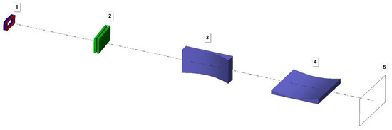 Schematic 3D view of the X-ray beamline showing the principle elements: 1—the output window of the ICS, 2—a Borrmann crystal monochromator (an equivalent channel-cut Laue representation is shown), 3,4—Kirkpatrick–Baez mirrors, 5—the focal (sample) plane. The input slits of the monochromator are not shown.
