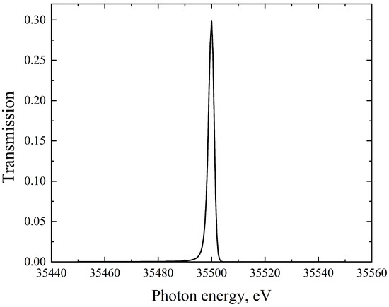 Figure 7 shows the calculated efficiency of the Borrmann anomalous transmission of a (220) germanium crystal with a thickness of 2 mm, cut at an angle of 90 to the surface (program code XCrystal 1.3 [21]). The incidence beam is set at the Bragg angle 5.01 for the photon energy 35.5 keV corresponding to the maximum of the ICS spectrum. As mentioned above, the Borrmann scheme allows one to maintain the direction of the transmitted X-ray beam for different Bragg angles and wavelengths.