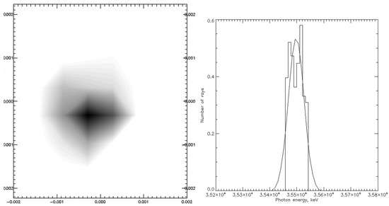 The initial set of rays for the SHADOW ray tracing were generated using a program code known as TSource, written for the calculation of inverse Compton scattering on the basis of the theoretical approaches mentioned in Section 2. Using the Monte-Carlo method, the calculated dataset of source rays represented the ICS radiation inside the working solid angle limited by the input slit of the used crystal monochromator (see below). The number of rays in this simulated X-ray beam of the ICS was N = 100,000 (see Figure 4). Note that the spectrum of the X-ray beam is maximal at a photon energy of 35.5 keV, and its intensity and angular distribution are determined by the parameters of interacting laser and electron beams.