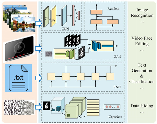 Similarly, neural networks have gradually become an emerging digital cover, joining the ranks of images, audio, and video. Recent advancements in artificial intelligence technology, particularly in deep neural networks, have led to significant breakthroughs in various application fields, such as computer vision, speech recognition, and natural language processing. Deep neural network models, including AlexNet [13], ResNets (residual networks) [14], CapsNets (capsule networks) [15], and GANs (generative adversarial networks) [16], have been designed and trained to perform a diverse range of intelligent tasks, as illustrated in Figure 1. These models can be easily shared, accessed remotely as API interfaces, and widely distributed for scientific research and industrial development needs. It is predicted that with the rapid progress of deep learning, neural networks will become a common commodity on model-sharing platforms and online app stores in the future.