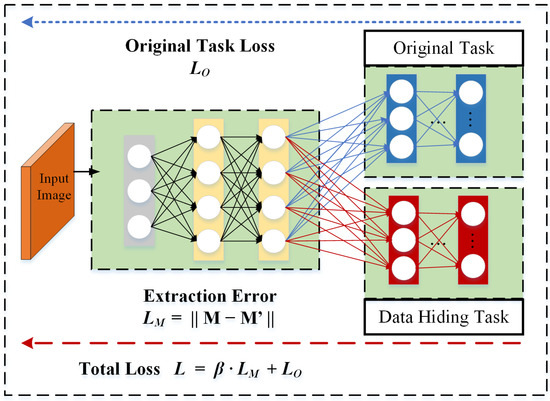 Model watermarking is a technique that involves hiding specific information, called a watermark, within a neural network model. Building well-designed deep neural network models requires a significant amount of effort, including the expertise of the designer and the use of large amounts of training data and computing resources. Therefore, protecting neural networks from being maliciously tampered with, distributed, and abused is of utmost importance. Model watermarking was proposed to embed watermarks into deep neural networks to protect the intellectual property of neural networks [17]. Watermarks were embedded into the model parameters of DCNNs using a parameter regularizer. To improve embedding and extraction performance, researchers designed an error backpropagation-based watermarking technique [19] for model authentication using selective weights for watermarking. In addition to model parameters, some researchers used specially crafted training samples and changed labels to train the target network [20] to carry watermark information. For watermark verification, specially crafted samples were input as triggers to activate pre-specified predictions at inference. In [21], the authors proposed a watermarking technique that deliberately output specific (incorrect) labels for certain inputs, using random training instances and random labels. In [22], a novel watermarking scheme was proposed that enabled adversarial examples to convey the desired information to the host neural network using a decision frontier stitching algorithm. Additionally, a digital watermarking framework was proposed for deep neural networks by embedding watermarks into the output images [23]. The well-trained host network can complete its original task while embedding watermarks. The authors of [18] designed a data hiding scheme in deep neural networks for multiple receivers. Large amounts of additional data were embedded into model weights by matrix coding [24] in the training process to minimize the impact on the original task, as shown in Figure 3. The scheme’s robustness and universality were verified.