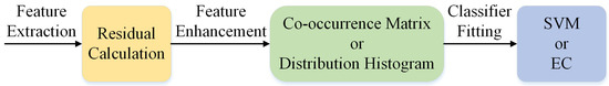 In [28], a steganalysis model based on statistical analysis was proposed for LSB steganographic images. By applying a histogram characteristic function (HCF) [29], researchers solved the problem of detecting least significant bit matching (LSBM) steganography in the spatial domain [30]. An adaptive steganalytic scheme was designed for the WOW [5] method by narrowing down the possible modified regions, and therefore the detection performance was improved in [31]. Except for spatial domain methods, a steganalysis scheme applied the Markov process to model different JPEG 2-D arrays, which were used to enhance changes caused by JPEG steganography [32]. Meanwhile, the dimensionality of transition probability matrices was reduced greatly by means of threshold truncation. Additionally, the authors of [33] achieved the goal of classifying single- and double-compressed JPEG images into one of the preselected existing steganographic algorithms by using a multi-classifier based on supervised training, which is of significance for the further extraction of the secret message from stego images. However, these steganalysis methods that specifically target a particular steganographic algorithm have failed to cope with content-adaptive methods. Moreover, low-dimensional features are also insufficient for capturing changes caused by secret information in images with complex textures. To address these issues, in [34], the ensemble classifiers were used to extract a variety of statistical characteristics as the steganalytic features, by assembling a rich model composed of diverse high-dimensional submodels. The residual images output from the high-pass filters were further used to calculate the co-occurrence matrix to enhance features, and the detection performance was greatly improved. In the transform domain, the authors of [35] proposed a high-dimensional JPEG steganalysis scheme using high-order cascade filters to capture embedding traces and employing the ensemble classifiers as a steganalyzer. As shown in Figure 4, traditional steganalysis methods for digital images generally include feature extraction, feature enhancement, and classifier fitting.