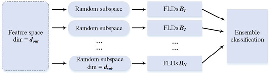 In addition to the SVM model, we also employed ensemble classifiers in our proposed scheme, which are known for their low computational complexity and ability to efficiently handle large training sets. Following the discussion of alternatives in [42], we implemented the ensemble classifier as a random forest consisting of base learners (individual learners). Each base learner was trained independently on a specific -dimensional subspace, which is sampled uniformly from the feature space at random. The construction of the ensemble classifier is shown in Figure 5. We denote the base learners as and we use Fisher linear discriminants (FLDs) as binary base learners in the ensemble classification for their simplicity and low training complexity. In the steganalysis literature, samples for ensemble classification are combined as pairs, i.e., the cover samples and the corresponding stego samples are bound together. Such pairs from the training set are denoted as . After each base learner provides a single vote, the ensemble classifier, denoted as (cover = 0, stego = 1), forms the final decision by aggregating all decisions of the base learners using majority voting strategy. By using bagging (bootstrap aggregating) [43], only about 63% of the unique samples in the training set were used for each base learner, and the remaining 37% unseen data can be exploited as validation set for the “out-of-bag” (OOB) estimate, which is calculated as: