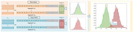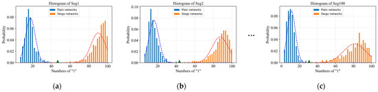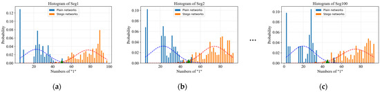 After the classifier was trained, we used it to predict the labels of the features, and based on that, we designed a symmetric method based on histogram distribution to determine the optimal thresholds for classification. Specifically, we denoted the number of networks to be tested as , and the testing set contained images, while the number of classes was , as defined in Section 3.1. We would like to clarify that the term “testing set” used in this context refers to a set of data used in the process of determining the optimal threshold for our proposed scheme. In machine learning or deep learning, a testing set is typically used to evaluate the performance of a trained model on previously unseen data. However, in our case, the testing set was used solely for the purpose of determining the optimal threshold. Specifically, we fed the data from this set into the trained classifier, which produced a 10,000-dimensional output consisting of labels with values of zero or one, with the size of the data matrix changing from to . Since the trained classifier learned patterns of the embedding traces, the presence of steganographic information caused a difference in the 0/1 ratio of the 10,000-dimensional output prediction labels for the stego network compared to that of the cover network. Then, these 10,000-dimensional labels were segmented on average, in which the length of each segment was set as and the numbers of label “1” were calculated as results, as shown in Figure 7. For each segment, we obtained figures calculated from the cover networks and figures calculated from the stego networks symmetrically. Then, histograms of these two strings of figures were generated, along with their respective probability density curves. The segment’s optimal threshold was determined by finding the unique valley between the two peaks (the intersection point) in the density curves. On the whole, the cover networks and stego networks undergo two highly symmetrical flows to generate their prediction labels to plot histograms and density curves.