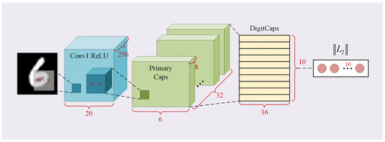 CapsNets: The fundamental architecture of CapsNets for the MNIST dataset is shown in Figure 9, including two convolutional layers (Conv1 and PrimaryCaps) and one fully connected layer (DigitCaps). More details can be found in Reference [15].