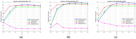 Detection accuracies of SVM with different values of C and kernel functions: (a) 100 embedded bits; (b) 600 embedded bits; (c) 6000 embedded bits.