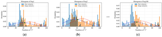 Histograms and fit density curves of segments for the case of changing embedding capacities, image datasets, and network structures: (a) Seg1; (b) Seg2; … (c) Seg100.