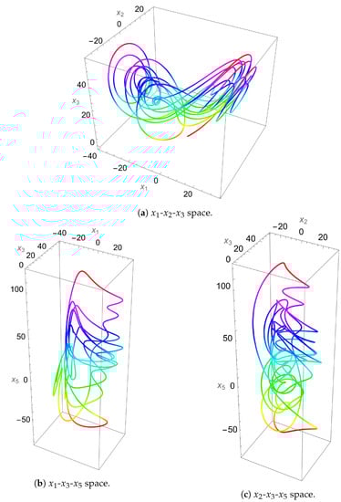 Hyperchaotic attractors for system (2) with , shown for various 3D spaces.