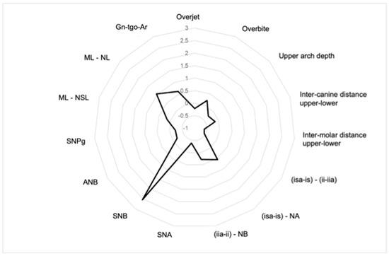No dental or skeletal variable evaluated presented a statistically significant difference between the final orthodontic-surgical treatment and the long-term retention phase. The mean of the difference between T2 and T1 is illustrated in the radar chart (Figure 2). Table 2 shows the mean, standard deviation, minimum and maximum values for dental and skeletal variables in the three time points as well as the difference between T2 and T1. Eight patients presented dental relapse (32–95% CI [12.4%; 51.7%]), but none (0%) had a skeletal relapse.