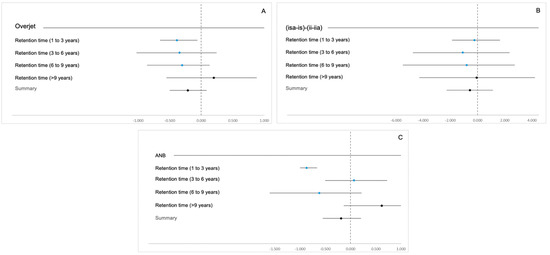 There were no statistically significant differences in the confidence intervals of the value of the difference of overjet, (isa-is)–(ii-iia) and ANB between T2 and T1 (KW, p = 0.821 KW, p = 0.988 and KW, p = 0.107, respectively) and the different retention times (Figure 3).