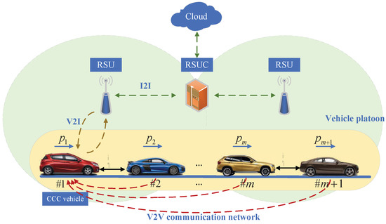 As depicted in Figure 1, the CCC system, based on the Internet of Vehicles, primarily comprises the vehicles, Roadside Units (RSUs), and the cloud. Specifically, this work focuses on a heterogeneous platoon of multiple vehicles traveling on a single lane. The CCC vehicle with the edge controller is in the tail, and the remaining vehicles are human-driven vehicles following the target vehicle m + 1 at the front of the platoon. Through V2V communication, the cruise control vehicle can obtain motion information from preceding vehicles, such as acceleration, velocity, and headway. Based on these information, the controller generates suitable real-time control strategies to ensure asymmetrical control stability.