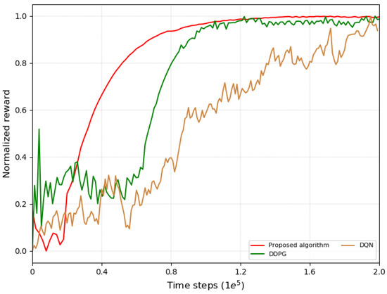 We evaluate the learning performance of the designed algorithm in relation to those of other classical DRL algorithms (i.e., DQN in [27] and DDPG in [30]) that do not consider time-varying factors. The hyper-parameters are set as follows: total training step , mini-bactch size 64, learning rates , discount factor , noise clip , policy delay . Figure 3 shows the normalized reward against the training step. The findings demonstrate that the proposed algorithm learns the most efficiently and converges before steps. The learning efficiency of DDPG is second, but it still fluctuates after convergence. However, algorithm DQN has the lowest learning efficiency and fails to converge within limited training. This indicates that it is challenging to learn CCC strategy in a complex dynamic environment, and the proposed algorithm may help learning by the MDP design considering the time-varying communication delay and desired state.