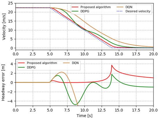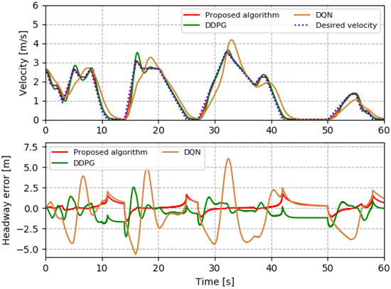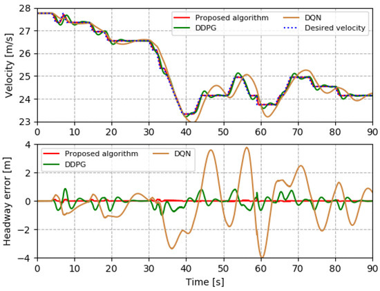 Next, a real-world dataset named DACT [33] is used to validate the effectiveness of proposed DRL-based intelligent control algorithm. The DACT data are a collection of driving trajectory data from Columbus and Ohio, and can be divided into multiple segments marked according to operation modes, such as acceleration and deceleration. In particular, three traffic scenarios are selected from the DACT dataset: a case with significant speed drop represents the harsh brake in an emergency situation, the speed variations around zero represent stop-and-go traffic in congestion, and the change in average speed represents the change in the speed limit in the road work area. As shown in Figure 4, Figure 5 and Figure 6, the proposed controller can accurately execute control decisions and track the desired states under three traffic scenarios. However, when using a controller trained by the DRL algorithm that does not consider time-varying factors, it may face greater speed variations and headway errors. For example, as shown in Figure 4, in order to achieve a harsh brake, the proposed algorithm provides fast control response and constant deceleration, while the other two algorithms respond slowly, which will cause too small of a headway and traffic safety problems. In the traffic congestion and road work areas of Figure 5 and Figure 6, the other two algorithms have obvious tracking errors, and the speed adjustment methods are more radical, which will not only reduce the driving comfort, but also endanger following and preceding vehicles. Therefore, the proposed controller has significant advantages in accurate tracking, comfort, and safety. In addition, using the real dataset DACT indicates that the proposed intelligent delay-aware control method has potential practical applications, such as urban driving control.