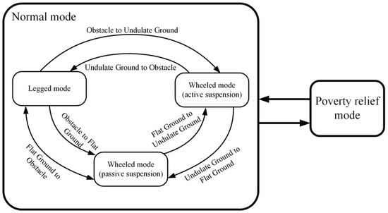 The wheel-legged robot needs to choose the appropriate motion mode according to the terrain conditions. When the terrain is relatively flat, the robot adopts the wheeled motion mode with a passive suspension to improve the efficiency of the roving exploration. In the wheeled motion mode with the passive suspension, the leg configuration remains unchanged, and the body may fluctuate slightly. The leg joints support all the weight of the robot through the internal mechanical lock, which can also reduce energy consumption. When the terrain is undulating, the robot needs to switch to the wheeled motion mode with active suspension, which allows the leg joints to adjust the configuration in time, according to the attitude changes of the body caused by the undulating terrain to ensure stability. When encountering obstacles, such as bumps, pits, and rocks, the wheel-legged robot needs to switch to the legged motion mode to cross the obstacles safely. Due to the unknown terrain conditions, emergencies are very likely to occur. Once the wheel is trapped, the robot can be switched to poverty relief mode to restore the wheel to a safe state. The wheel-legged robot motion mode selection and switching relationships are shown in Figure 3.