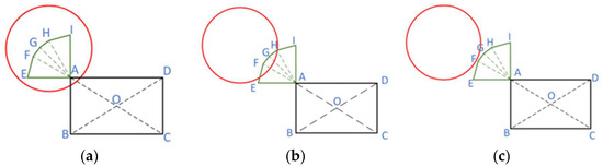 According to Section 2, the projection of the workspace of the wheel in the horizontal plane is a fan-shaped region. When the body is in a certain position, if the fan-shaped area is completely located in the obstacle area, the wheel cannot avoid collision with the obstacle. Furthermore, as the grid map of the body is generated for the center of the body, when the center of the body is near the obstacle, the edge of the body may collide with the obstacle. Although there is no actual obstacle in the position of the center of the body, the position is still an impassable area for the center of the body. This paper hypothesizes that the position is occupied by a “virtual obstacle”. As shown in Figure 8, the rectangular ABCD represents the body, while point O represents the center of the body. For ease of analysis, the fan-shaped area was simplified to a hexagon AEFGHI, and the red circle represents the obstacle. The relationship between the hexagon AEFGHI and the obstacle area can be approximately judged by calculating the distances from point A, point E, point F, point G, point H, and point I to the center of the circular obstacle. In Figure 8a, the hexagon area is completely within the obstacle area. Hence, the position of the center of the robot body O is considered to be occupied by the virtual obstacle. In Figure 8b, part of the hexagon area is in the red obstacle area, and the collision between the wheel and the obstacle can be avoided by adjusting the leg configuration, meaning it is considered that the position of the center of the robot body O belongs to the feasible area. In Figure 8c, the hexagon area is completely separated from the obstacle area, in which case, the position of the center of the robot body O belongs to a feasible area. Furthermore, the virtual obstacle caused by the collision between the edge of the body and the obstacle can be judged by the distance between the center of the body and the center of the obstacle.