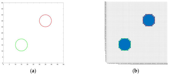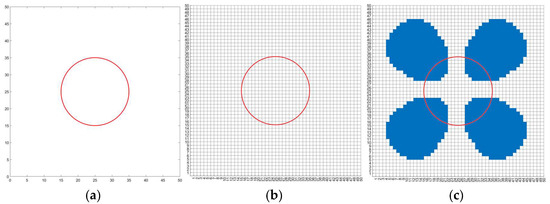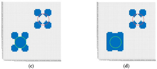 As shown in Figure 9a, a circular complete obstacle is located in the center of a 50 × 50 cell grid mapping the scenario, the position of the center is (25,25) and the radius is r = 10. The outline of the obstacle is represented by a green circle. When generating a grid map for the body, the state of the grid is first set within the circular area to the occupied state to obtain an original grid map, as shown in Figure 9b, and then, the area occupied by the virtual obstacle is identified. Merging the abovementioned two kinds of obstacle areas can provide the grid map for the body, as shown in Figure 9c.