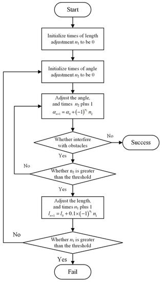 By now, most path-planning algorithms are aimed at wheeled robots, which have a fixed configuration. The security of a robot must be considered, firstly, during path planning [8,9]. The collision between the robot and an obstacle can be avoided effectively by expanding the size of the robot and the obstacle. Hence, the wheeled robot can be simplified as a point, which greatly reduces the complexity of path planning. However, since the wheel-legged robot can adjust the configuration to adapt to the terrain with redundant degrees of freedom, it can no longer be simplified as a point. Guo et al. [10] simplified the wheel-legged robot, NAZA, to a cuboid with a fixed length and height but variable width. The change in the width of the cuboid corresponded to a change in the configuration of NAZA, whereby collision detection was carried out on the edge of the cuboid. Raghavan et al. [11,12] simplify the wheel-legged robot Centauro to a variable rectangle or a trapezoid and added a constraint that if the sum of the length and width of the rectangle is a fixed value, then, the path should be planned in a two-dimensional map. Though the wheel-legged robot is equivalent to a variable cuboid or rectangle, the influence of a configuration change on path planning can be considered, although the planning process for two-dimensional graphics is still very complex.