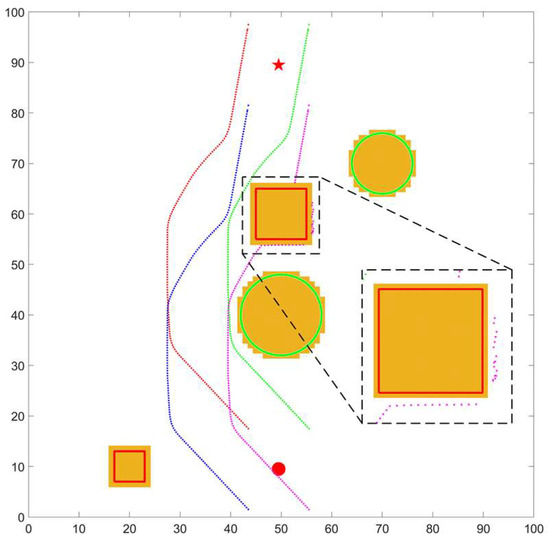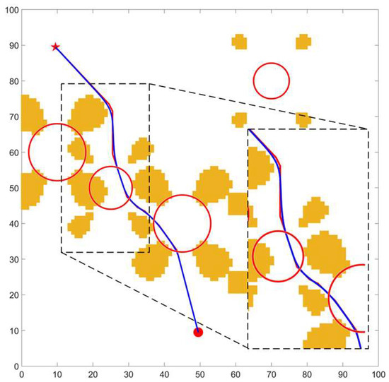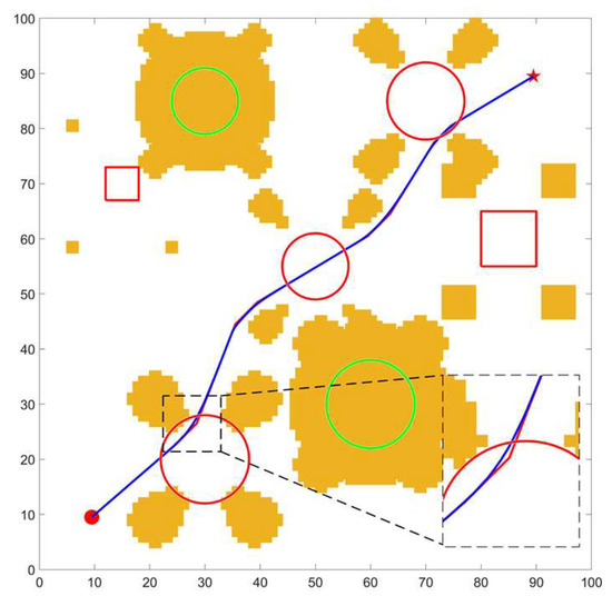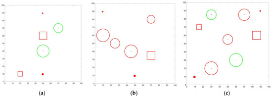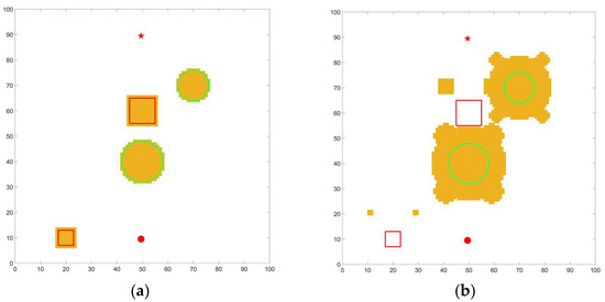 According to the structural parameters shown in Table 1, this paper takes an area of 10 m × 10 m as the example. Taking 0.1 m as the edge length of the grid means a grid map with a size of 100 × 100 can be obtained. In the following figures, the horizontal axis and the vertical axis are the number of grids. In order to simplify the figure, the grid numbers of two axes are shown at intervals of 10. To verify the feasibility of the proposed algorithm for different types of obstacles, three types of grid maps are set up in the simulation. In the first map, all the obstacles are complete obstacles, represented by green circles, as shown in Figure 17a. In the second map, all the obstacles are incomplete obstacles, represented by red circles, as shown in Figure 17b. The third map consists of a mixture of complete obstacles and incomplete obstacles, with green circles representing complete obstacles and red circles representing incomplete obstacles, as shown in Figure 17c. In addition, the solid red circle represents the start point, and the solid red five-pointed star represents the target point.