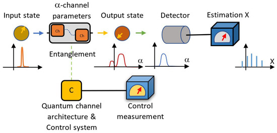 In particular, we are interested in the characterization of quantum channels. If fact, a quantum channel could be understood as an operation performed on a quantum state . A set of parameters characterizes such an operation modifying the initial state of the target system into as an outcome. A quantum channel could then represent a medium or an environment where the quantum system remains or moves on. Then, those parameters characterise the effect of each specific channel on a quantum probe state , being transformed into . Such a transformation carries out information coming from the parameters. The process is illustrated in Figure 1.