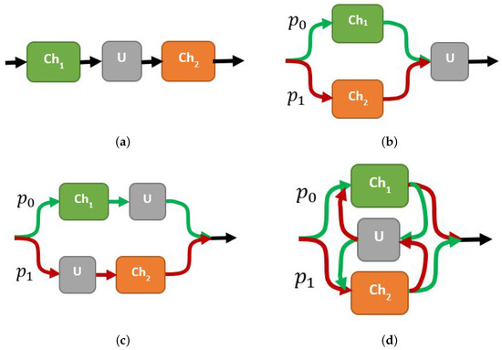 Figure 2a corresponds to a sequential arrangement (S + U), including an intermediate unitary control operation as that suggested by [28]: , with . Figure 2a and b correspond to superposition paths including the same previous unitary operation at the end (PS + U) or alternated (PSA + U) after and before as a function of the path. Finally, Figure 2d presents an indefinite causal order (ICO) arrangement (ICO + U) with the same intermediate unitary operation. Only the sequential arrangement does not require a control system (otherwise, it will remain separable through the process), which could be assumed to be prepared in the state . However, we should work on ; our treatment has already integrated the control system in (6).