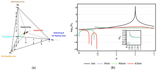 By proceeding numerically, we swept the selectable parameters under a numerical stochastic approach to reach the optimal values of or for each possible Pauli channel. This outcome is notable because, under the same analysis, the entire Pauli channels family has been analysed, instead of only particular channel cases. Upon the consideration of a single-parameter approach , a first insight for the four architectures considered (S + U, PS + U, PSA + U, and ICO + U) was reached. In that region, the PS + U and PSA + U arrangements exhibited a certain superiority, minimising for most of the p values. Despite this, the ICO + U scheme shows regions of superiority (see Figure 3).
