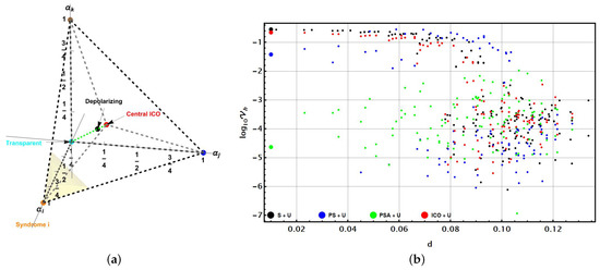 Figure 4 shows the outcomes. Each dot represents the outcome of a channel and architecture. Outcomes are presented as a function of and the distance d to the channel exhibiting the pure syndrome just in the corner , with and a cyclic permutation of . The dot colour represents the architecture used in agreement with those colours used in Figure 3. Due to the different scales of the outcomes, a -scale has been used again. They were generated by sampling the shadowed wedge region shown in Figure 4a. Sampling was performed as Cartesian uniform in the region. The biggest points on the left of Figure 4b correspond to the closest to the syndrome channel considered in the corner.