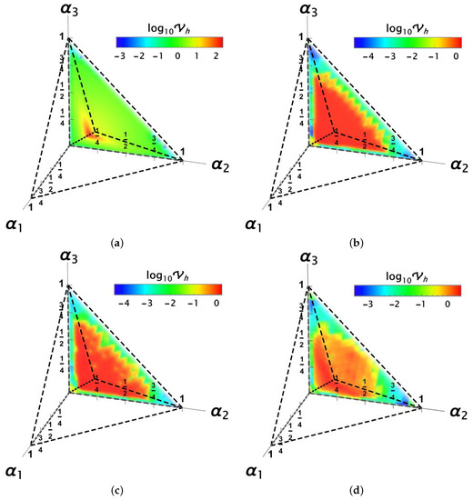 A general view on the entire parametric space of Pauli channels for the optimised values of for (a) S + U, (b) PS + U, (c) PSA + U, and (d) ICO + U cases. Values are represented in colour in agreement with the colour bar at the top.