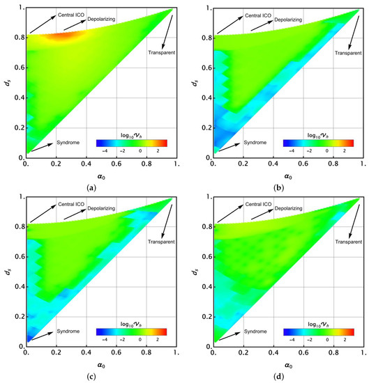 An alternative two-dimensional view of the last outcomes has been constructed by representing the values of as a function of and the minimum distance to the closer syndrome, (they are suggested by the three-dimensional plots in Figure 5). In such a representation, dots become superposed. Figure 6 shows those representations for (a) S + U, (b) PS + U, (c) PSA + U, and (d) ICO + U. In this case, the same colour scale has been used to ease the comparison between the architectures. There, is reported. In addition, the main emblematic channels have been signalled: transparent, syndrome, depolarising, and central ICO channels. In this representation, the three borders of the plotted region correspond to (a) the central line analysed in Section 4.1 (upper frontier), (b) the line along each axis (rightmost frontier), and (c) the line connecting the central ICO channel with the syndrome , meaning (leftmost frontier). This representation clearly exhibits the goodness of each architecture by region. The observations fit with the previous discussion of Figure 5. Note particularly the advantage of PSA + U very near to the syndrome and also the limited advantage of using an architecture involving ICO.
