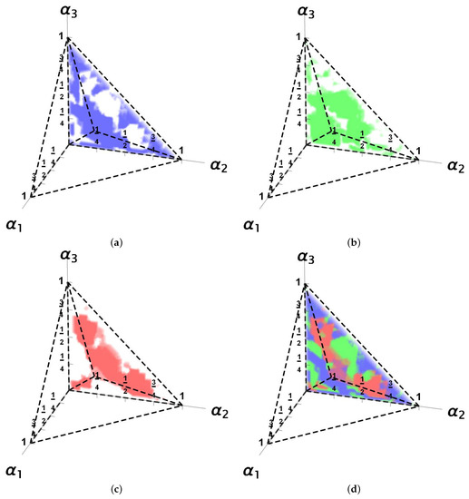 A final analysis to set a hierarchy among the architectures could be obtained by comparing the bounds found for each channel. Thus, for the multiparametric case, Figure 7 shows the regions where each architecture provides the lowest bound. The S + U case was omitted because, for every channel, it always provides the worst bounds. All other architectures have channel regions with the best bound among the three cases: Figure 7, (a) PS + U (blue); (b) PSA + U (green); and (c) ICO + U (red). Again, just one-third of the entire parameter space is illustrated for clarity. The grainy structure of these regions is notable (note particularly the entire picture in Figure 7d, already noticed in Figure 5 and Figure 6, instead of well-defined three-dimensional regions as those cases reported in [9], not considering the support of unitary controls). In these architectures, control unitary operations finally efficiently drive the manipulation process to address an improved QPE.