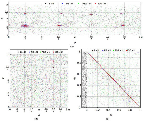 In another view, the pairs are presented in Figure 5b. It is clear that in any case there are no evident correlations between this pair of parameters, which now are completely and uniformly distributed. This indicates that unitary operations (rotations on the Bloch ball) do have not a privileged direction relating each parameter with another. Finally, Figure 5c shows the relation between and for PS + U (blue), PSA + U (green), and ICO + U (red) cases. Notably, many optimised solutions exhibit the relation , as it becomes evident from the plot.