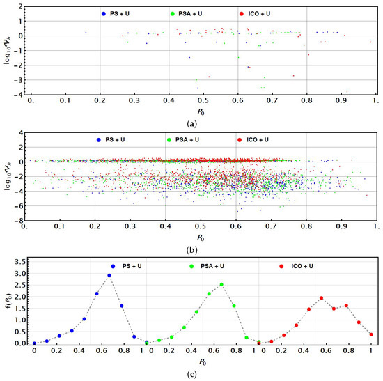 Considering that the optimisation problem exhibits multiple solutions in spite of the number of selectable parameters, it is not expected that consistently exhibits the largest possible values. Thus, the outcomes for the previous analysis have simply been used to analyse the behaviour of the success probability . Because the concrete values for the parameters p or will hardly show a certain correlation with , the analysis for this value is correlated with the value of (or in the plots). Thus, for the reduced number of solutions obtained in the single parameter case characterized by p, Figure 9a shows the corresponding correlations between and . Again, each architecture is coloured as before. Each dot represents one solution through the central lines for a given architecture. All cases PS + U, PSA + U, and ICO + U exhibited values regularly over in most cases.