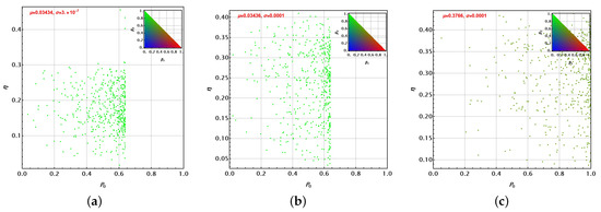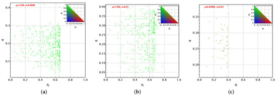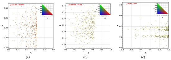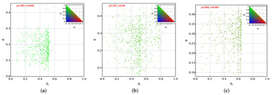 Clearly, . Each one of these parameters independently reflects the variation of each set of parameters with respect to their averages. Thus, because of the normalisation introduced, the larger will denote the main source of variation in each set of solutions. Thus, in the following Figure 10, Figure 11, Figure 12 and Figure 13, the dot colour for each set represents a red–green–blue (RGB) mixture reflecting that balance: the probe state (red), the unitary control (green), or the control state definition and its optimal measurement (blue). The colour is then settled by the colour scale in the triangular chart at the top right as a function of and (). Thus, Figure 10 presents several facts. First, parameters appear upper-bounded approximately by for the PS + U and PSA + U cases. This is not observed for the ICO + U case. Dispersion around the average is comparable for the three cases (values of ). In addition, the main source of variation is due to the unitary control U parameters for PS + U and PSA + U (). For the ICO + U case, the variation due to the probe state becomes a little more important than in the previous cases. Almost no variation is due to the control state. The parameters and show only tiny variations obtained by our optimisation procedure to reach the optimised solutions.